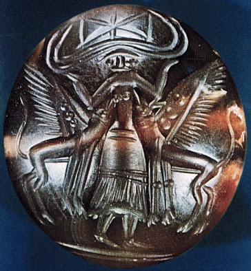 | Imagem 72 - Selo com a representação de uma Deusa com chifres ladeada por grifos a serem amamentados. O arquétipo da Potnia é frequentemente encontrado na arte do oeste da Ásia, aqui a Deusa aparece como a Mãe dos Animais (e de criaturas fantásticas também). Nota para o machado duplo (labrys) entre os chifres. |