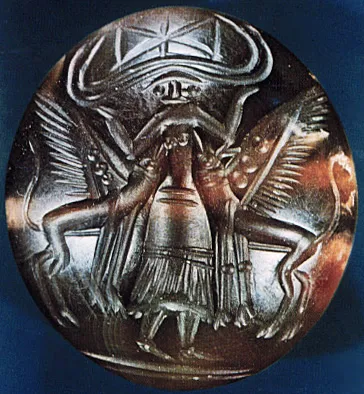 Foi encontrado no palácio de Cnossos num cilindro-selo com uma imagem que é especialmente interessante. Representa uma mulher de pé no topo de uma montanha, ladeada por dois leões. Claramente, esta foi a imagem, a qual passámos a associar a Grande Deusa-Mãe Cibele, tal como encontrada na Turquia.