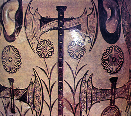 | Imagem 71 - Detalhe de ânfora decorada com machados e rosetas. As pegas aparecem-se como orelhas flanqueando labrys, que é um objecto simbólico da Deusa Cretense. |