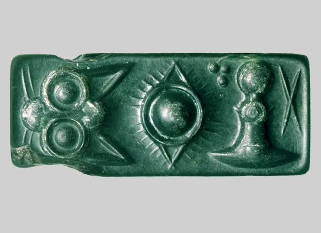 | Imagem 69 - Selo em jaspe verde com hieróglifos Cretenses, 1800 a. C. |
