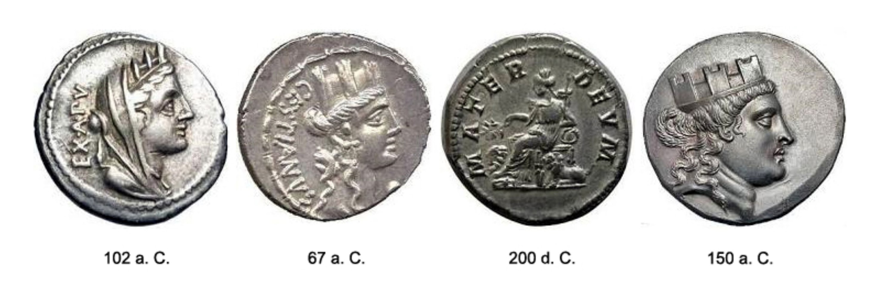 Mesmo um estudo superficial das moedas Romanas revela rapidamente um grande número de imagens de Cibele, isso demonstra claramente que ela era uma divindade com alguma importância e popularidade. Ela aparece na cunhagem oficial de imperadores, tal como Nero, Adriano, Autoninus Pio, Commodus, Septímio Severo, Geta e Caracala, bem como nas moedas das imperatrizes Sabina, Faustina, Lucilla e Julia Domna. Além disso, ela também é encontrada nas moedas de pequenos ofícios, comemorações especiais dos vários jogos Romanos, vitórias militares, e na cunhagem de quase todas as províncias Romanas do Oriente Próximo e Médio.