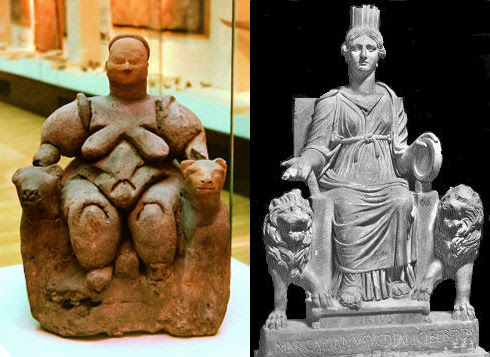 | Imagem 14 - À esquerda, estátua da Deusa-Mãe Catal Hoyuk, por volta de 6200 a. C. (observe os leões). À direita, estátua romana da Grande Deusa-Mãe Cibele esculpida 6000 anos mais tarde. |