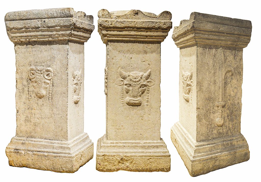 | Imagem 41 - Três lados de um altar de Taurobolium, ilustrando a bucrânia e uma faca de sacrifício, com uma dedicação à Grande Idaean, Mãe dos Deuses, de Lugdunum (Lyon). |