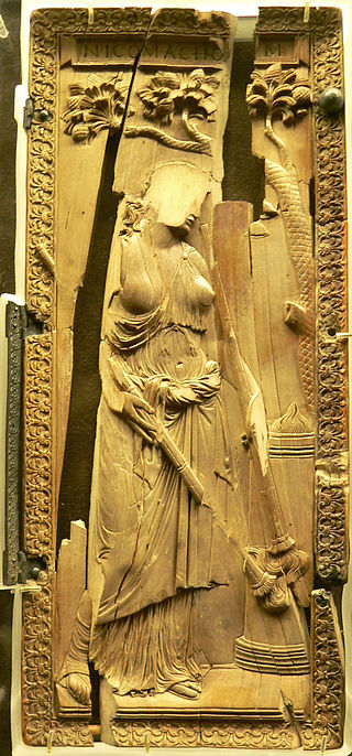 | Imagem 45 - Díptico de marfim de uma Sacerdotisa de Ceres, ainda no estilo totalmente clássico, c. 400, que foi desfigurado e atirado a um poço em Montier-en-Der. |