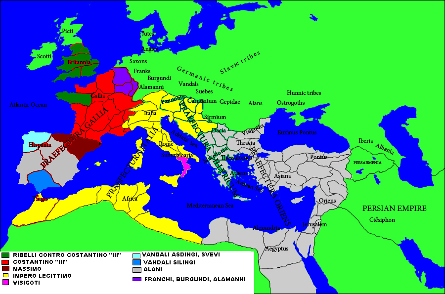 Em 410 d. C., o império Romano ocidental entrou finalmente em colapso. O saque dos templos tinha proporcionado dinheiro rápido o suficiente para mantê-los por um tempo, mas quando isso terminou, o império ficou completamente falido, com o seu tecido social antigo destruído e as pessoas aterrorizadas pelo seu próprio governo, tendo sido rapidamente atacados pelo chefe Visigodo Alarico I.
